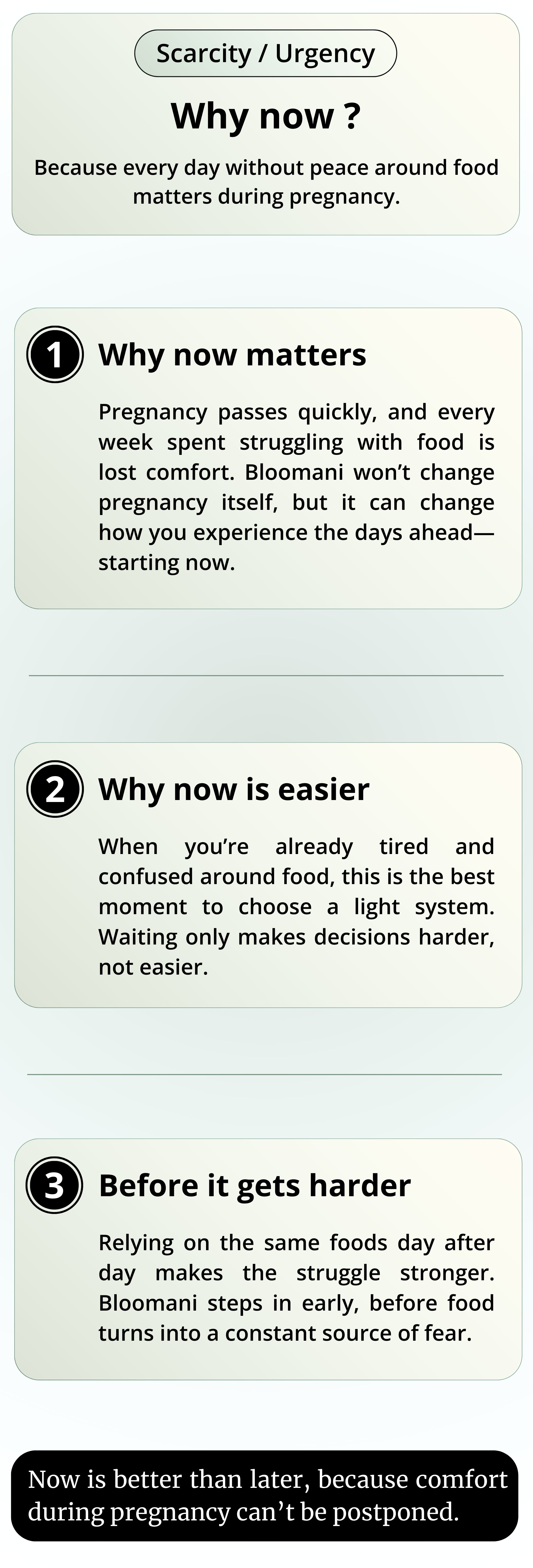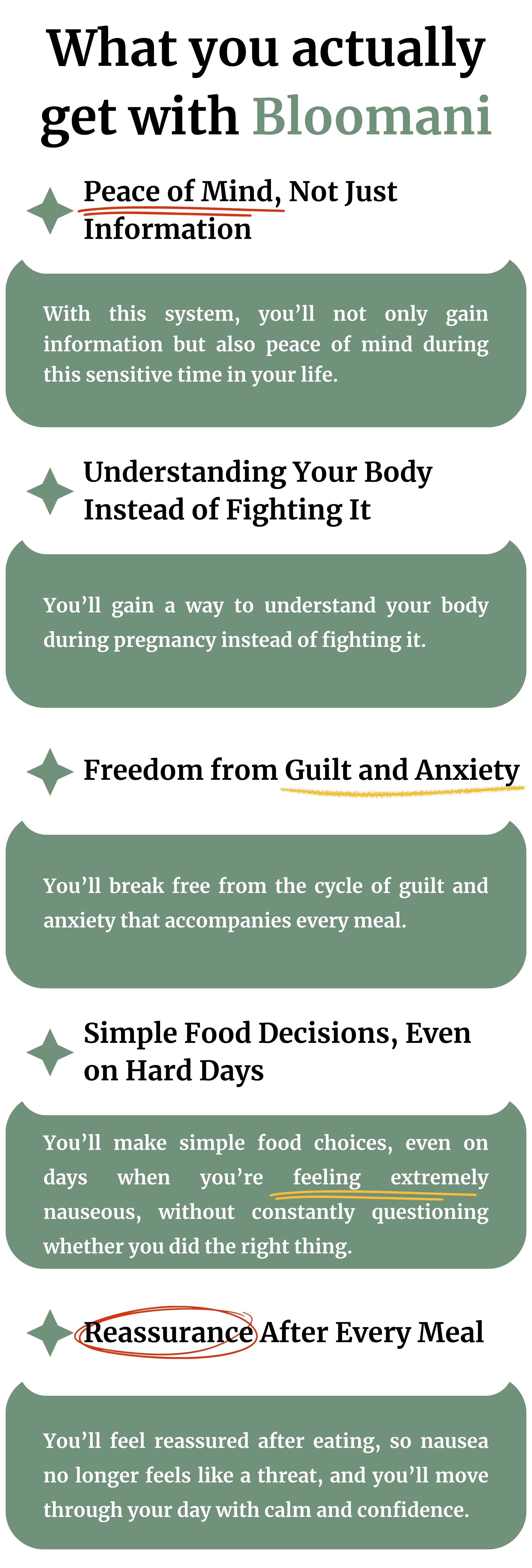 Bloomani is built on medical understanding of pregnancy changes and provides reassurance and nutritional safety instead of fear-based advice that undermines trust.